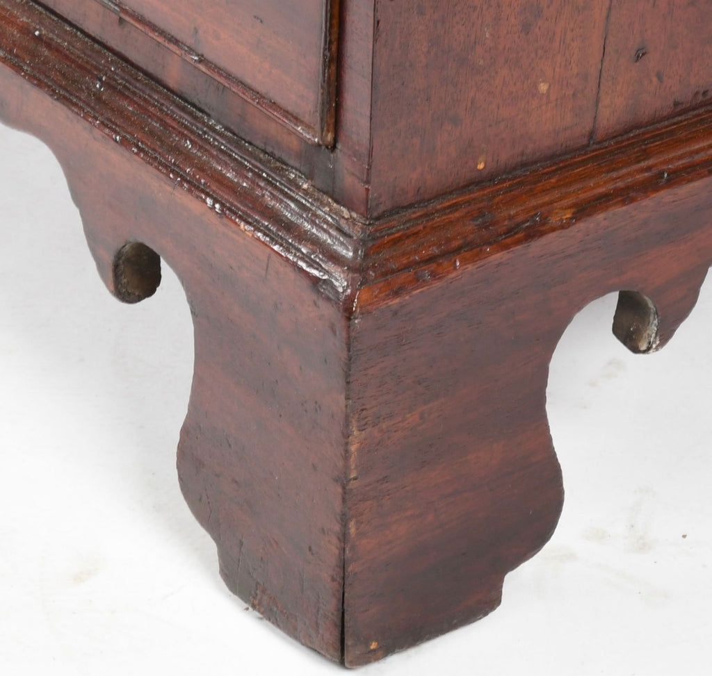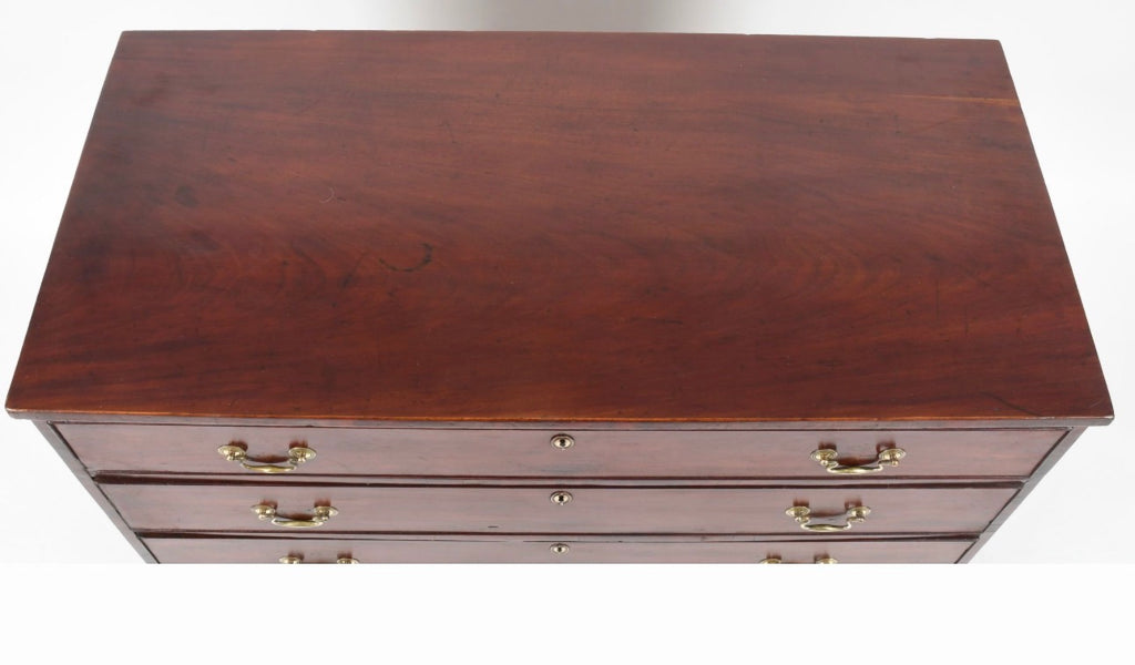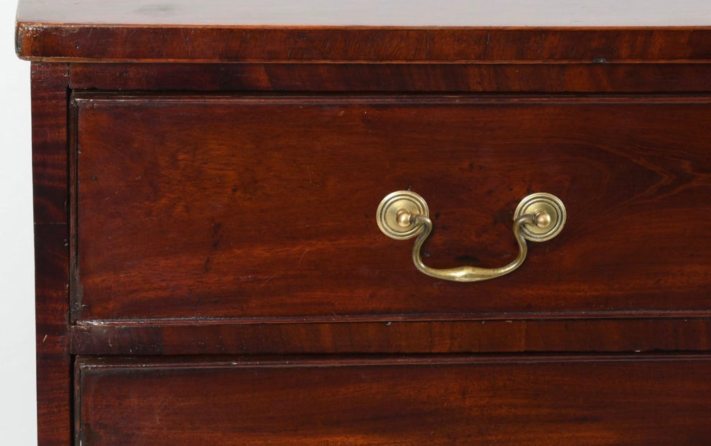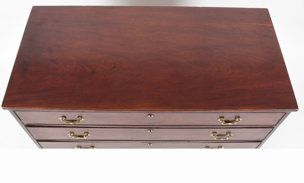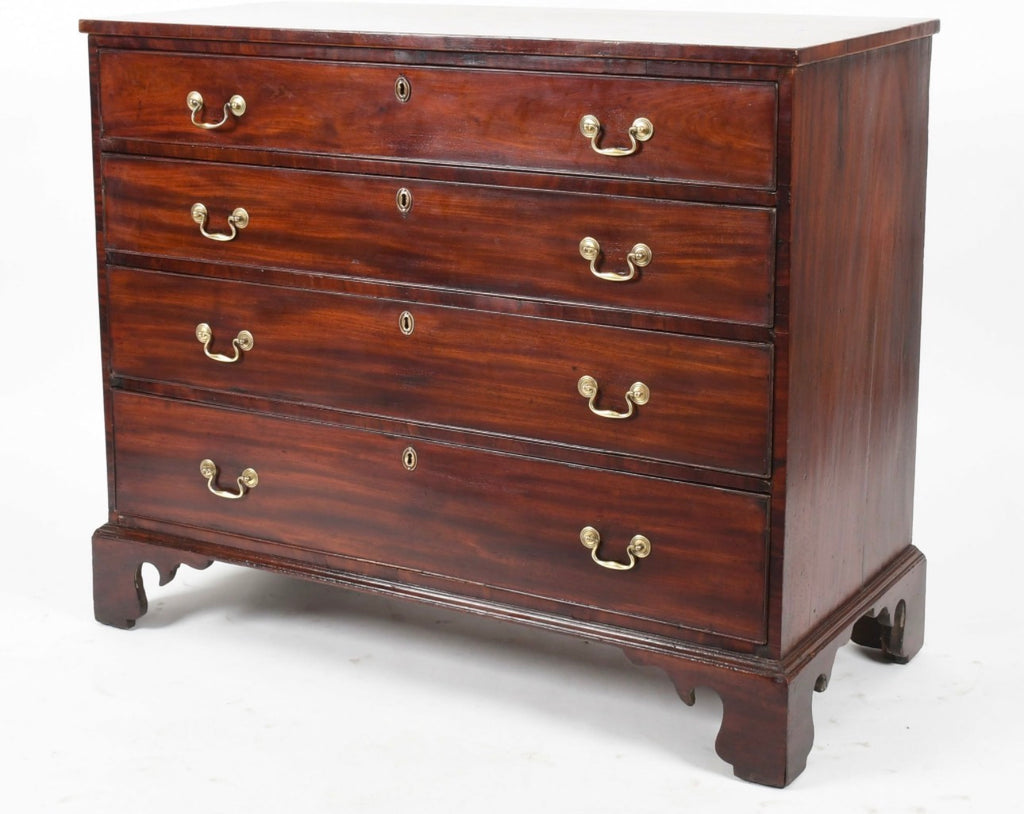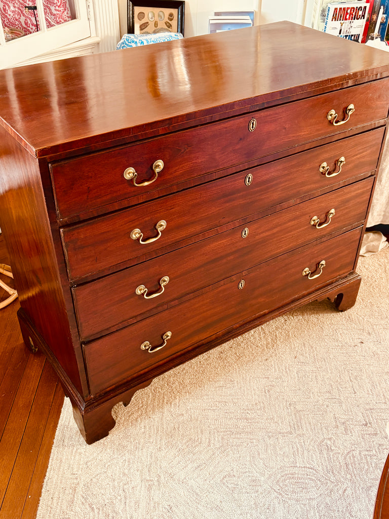 A fine American Federal period chest of drawers dating to approximately 1795–1810, reflecting the transition from late Chippendale to early Federal design. Crafted in rich mahogany with beautifully aged patina, this four-drawer chest features graduated drawers, original-style brass bail pulls with oval escutcheons, and classic bracket feet.
