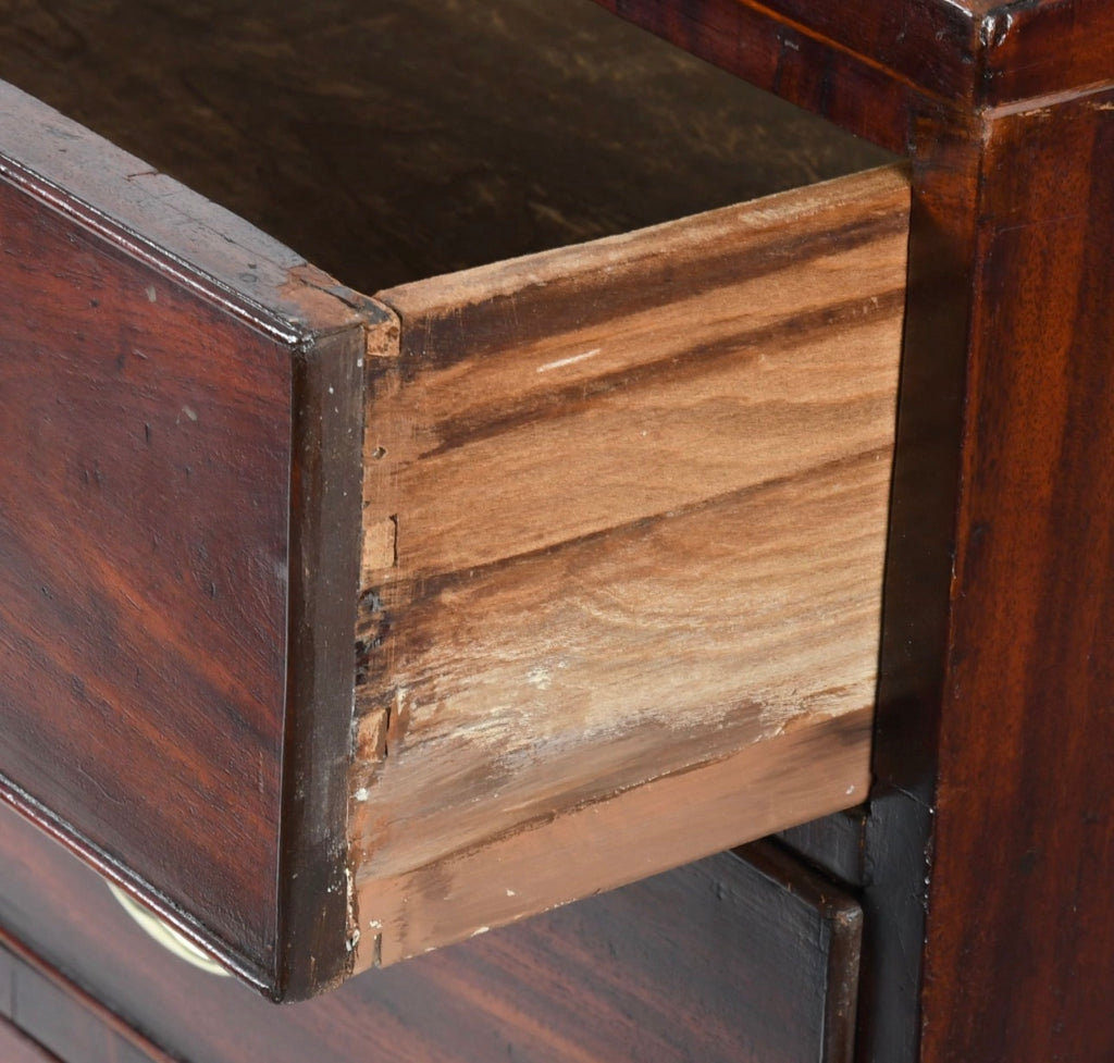 The chest is constructed with hand-cut dovetail joinery and secondary woods typical of the period, including pine and poplar. The top retains a warm, softly glowing surface with natural wear consistent with over two centuries of use. The interior drawers show honest age, with wide boards and visible tool marks that speak to its early American craftsmanship.
