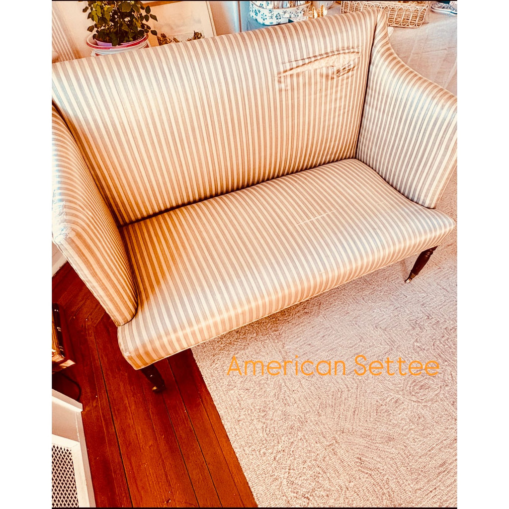 Antique Sheraton mahogany upholstered settee, the front legs raised on casters. 34in tall x 49in wide x 27 in deep. Needs new upholstery.