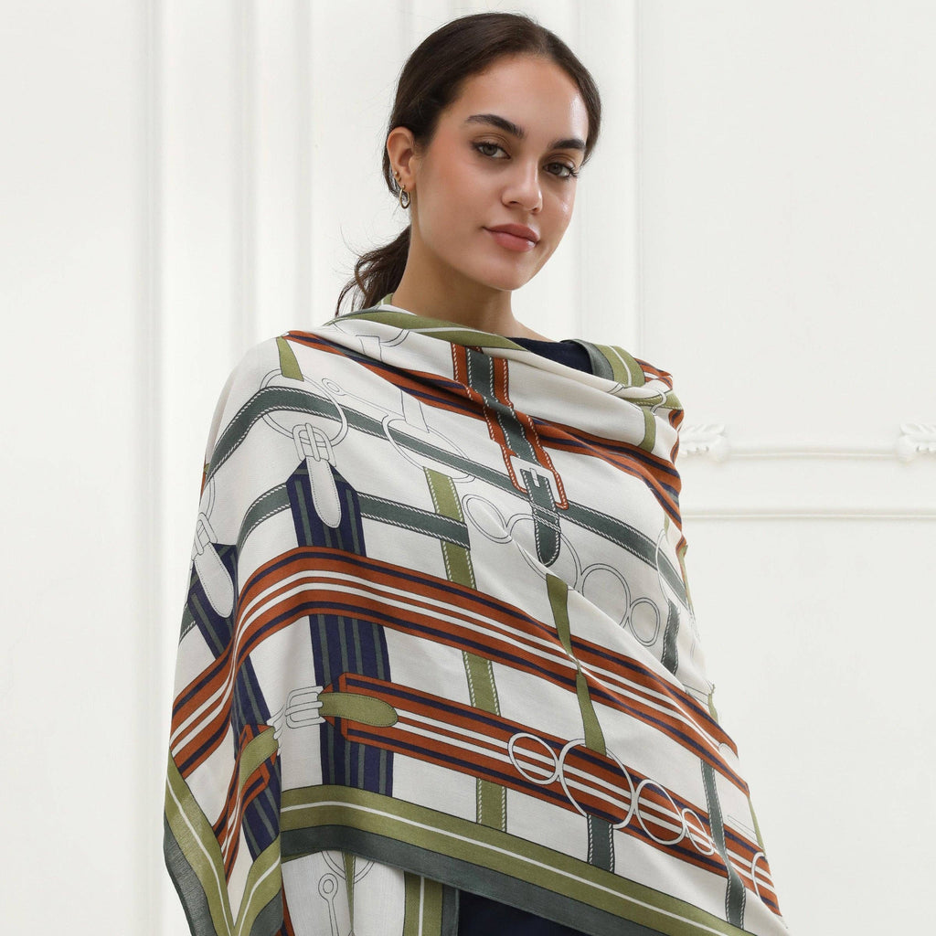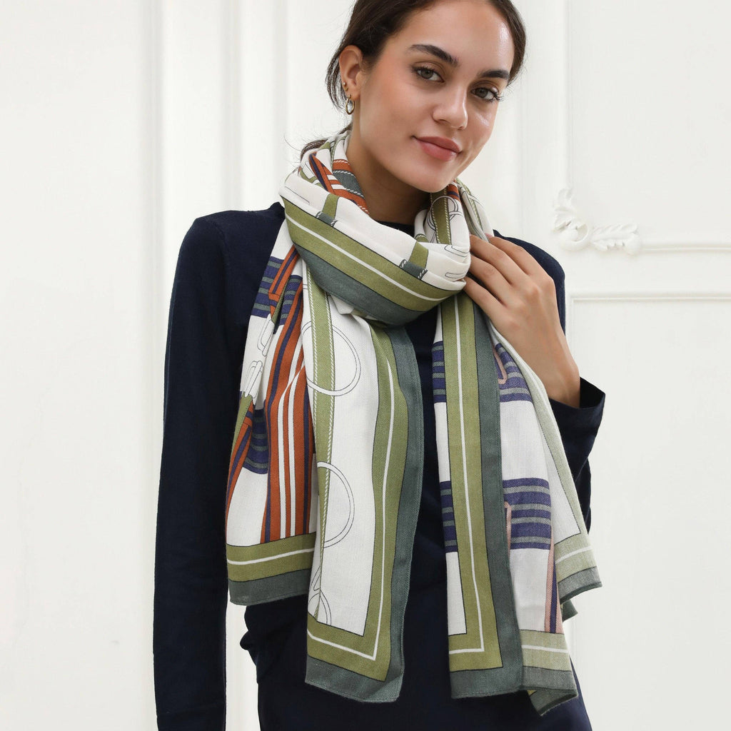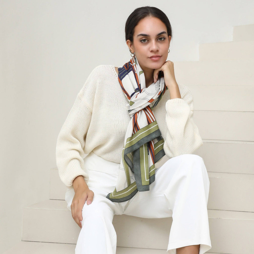 The Leigha brings a modern edge to a timeless accessory. This imitation cashmere scarf features a bold geometric print in olive green, navy, tan, and white—an effortless blend of earthy and elevated tones that complement any wardrobe. Lightweight and breathable, it’s the perfect transitional piece for layering through changing seasons.