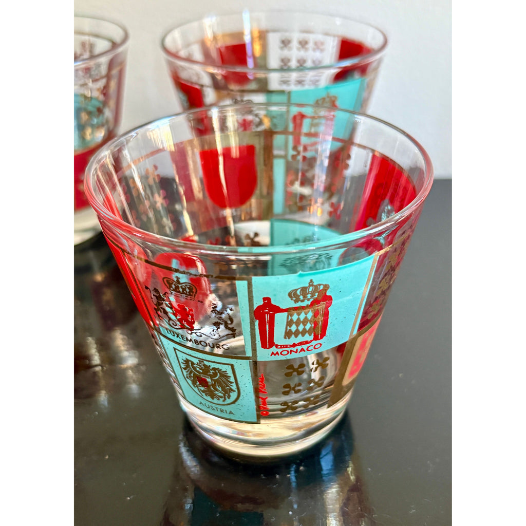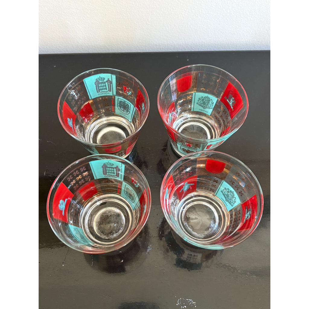 Striking set of four vintage Fred Press lowball glasses featuring colorful heraldic crests and European coat-of-arms motifs accented with gold detailing. Designed in the iconic mid-century Fred Press style, the glasses showcase panels of rich red, turquoise, and gold with country emblems including Denmark, Luxembourg, Monaco, and Austria.
