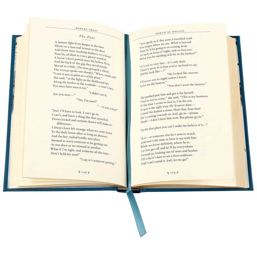 The early works of beloved poet Robert Frost, collected in one volume. The poetry of Robert Frost is praised for its realistic depiction of rural life in New England during the early twentieth century, as well as for its examination of social and philosophical issues. Through the use of American idiom and free verse, Frost produced many enduring poems that remain popular with modern readers. A Collection of Poems by Robert Frost contains all the poems from his first four published collections: A Boy’s Will (1913), North of Boston (1914), Mountain Interval (1916), and New Hampshire (1923), including classics such as “The Road Not Taken,” “Fire and Ice,” and “Stopping by Woods on a Snowy Evening.” This handsome leather-bound volume is an elegant addition to every poetry lover’s shelf.