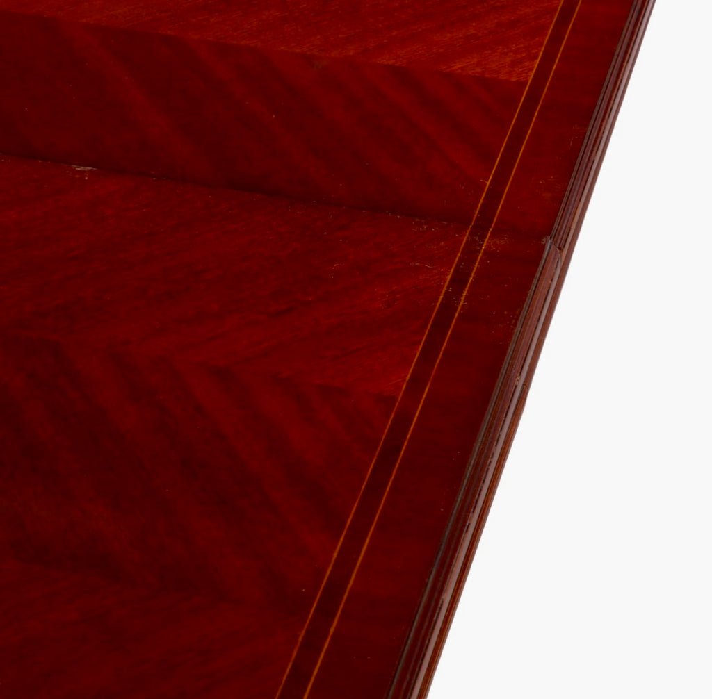 A large French mahogany Louis XVI style dining table having intricately veneered top and fluted legs with two original leaves circa 1930.