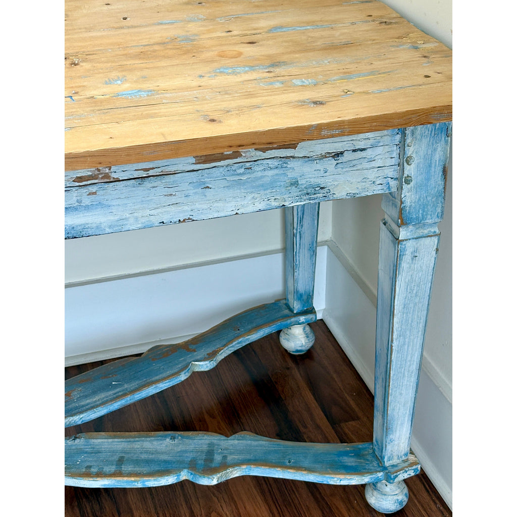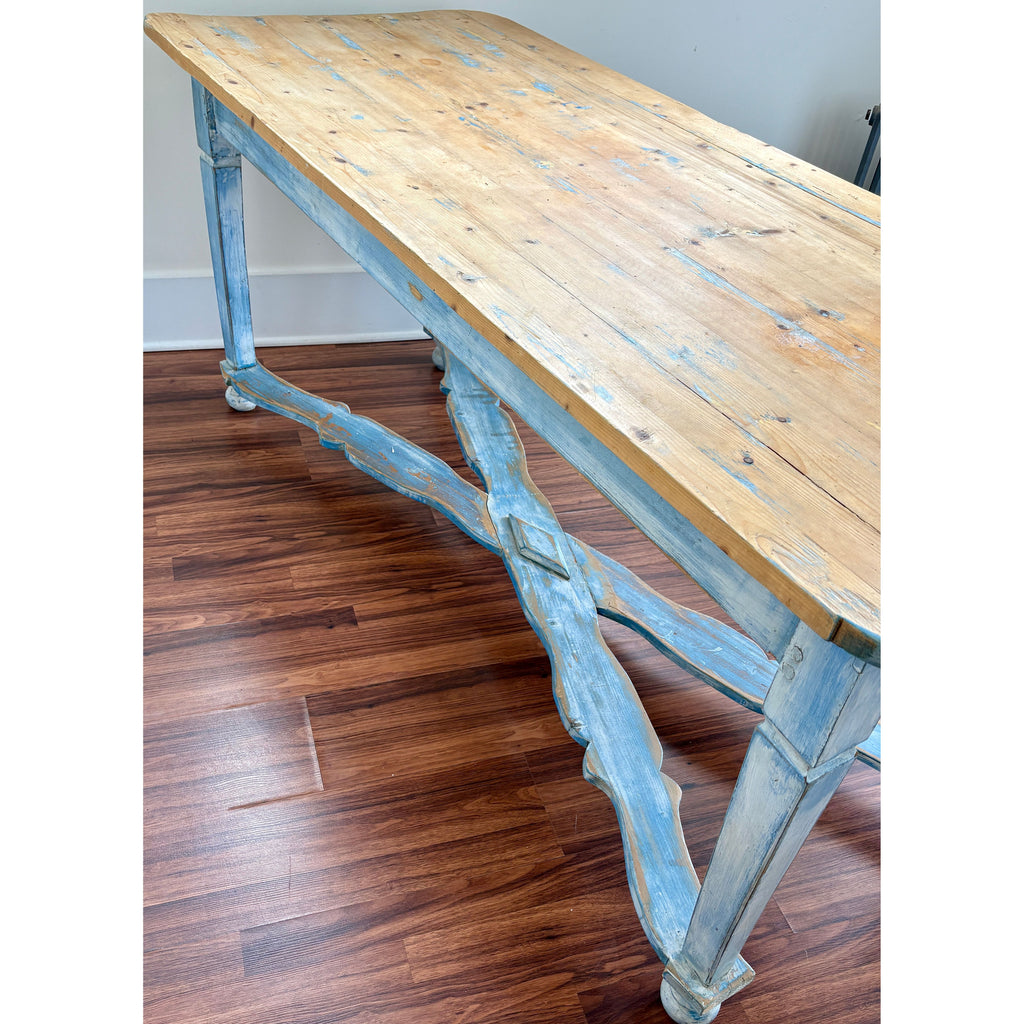 Antique Belgian farm table featuring a beautifully weathered painted base in soft blue tones paired with a warm natural pine plank top. This substantial table showcases classic European country craftsmanship, including a hand-carved crossed stretcher, turned bun feet, and gracefully shaped apron details.