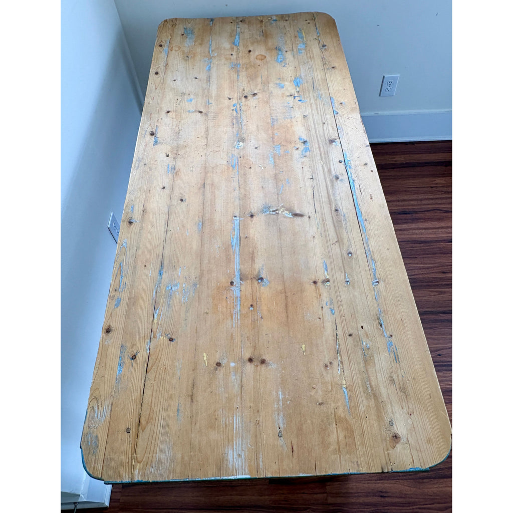 The top displays authentic age and patina with visible grain, old paint traces, and surface wear consistent with decades of use — adding to its rustic charm and character. The distressed painted base retains its original finish, creating a striking contrast with the honey-toned wood surface.