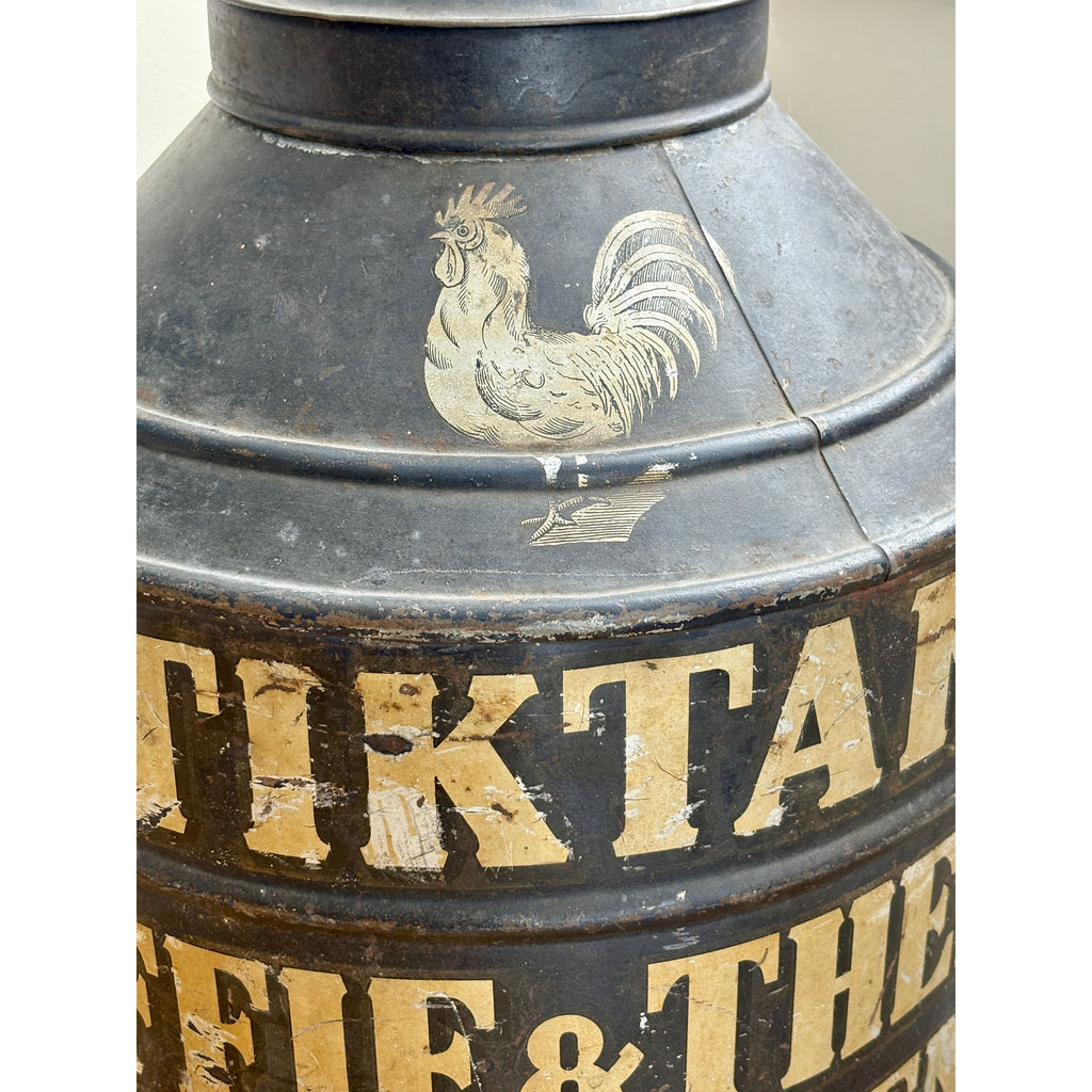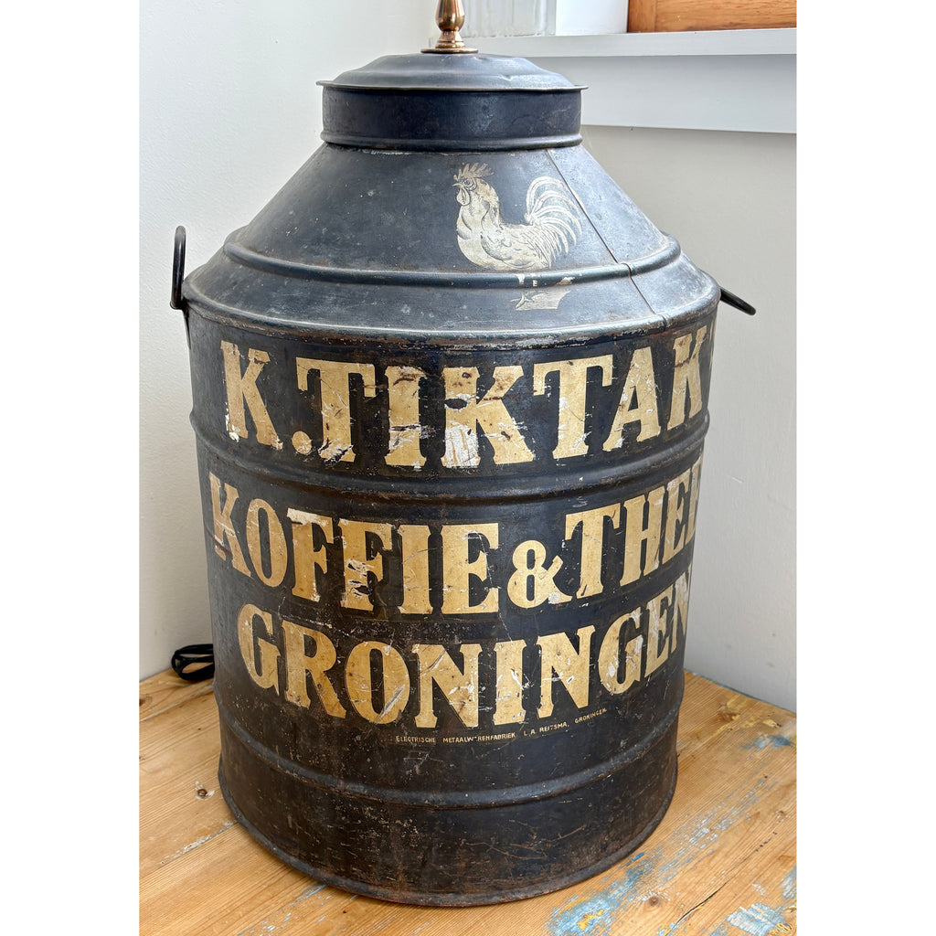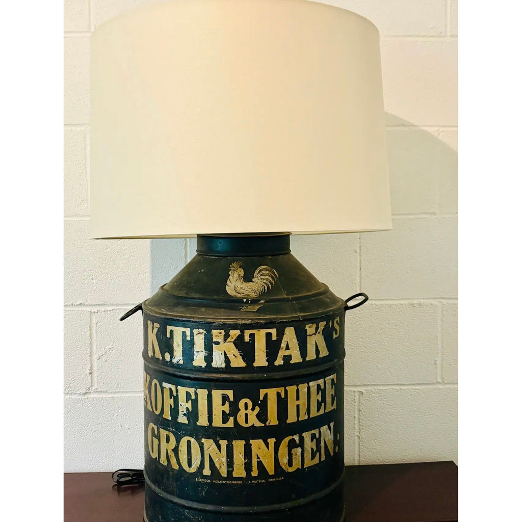 This vintage Dutch metal coffee and tea tin — boldly lettered “K. Tiktak’s Koffie & Thee – Groningen” — has been converted into a one-of-a-kind table lamp. With its dramatic black ground, aged cream typography, and iconic rooster emblem, it carries the patina and presence only time can create.