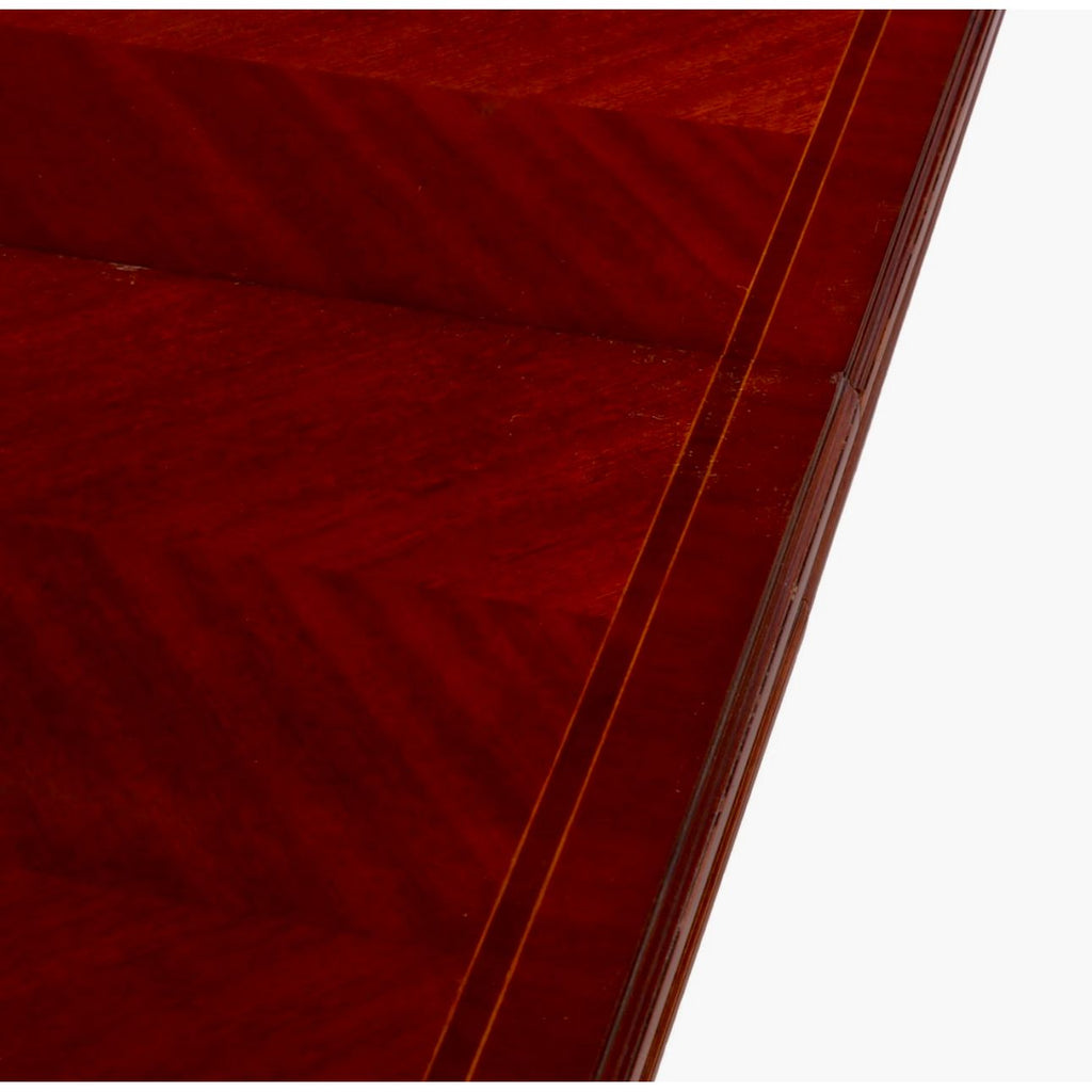 A large French mahogany Louis XVI style dining table having intricately veneered top and fluted legs with two original leaves circa 1930.